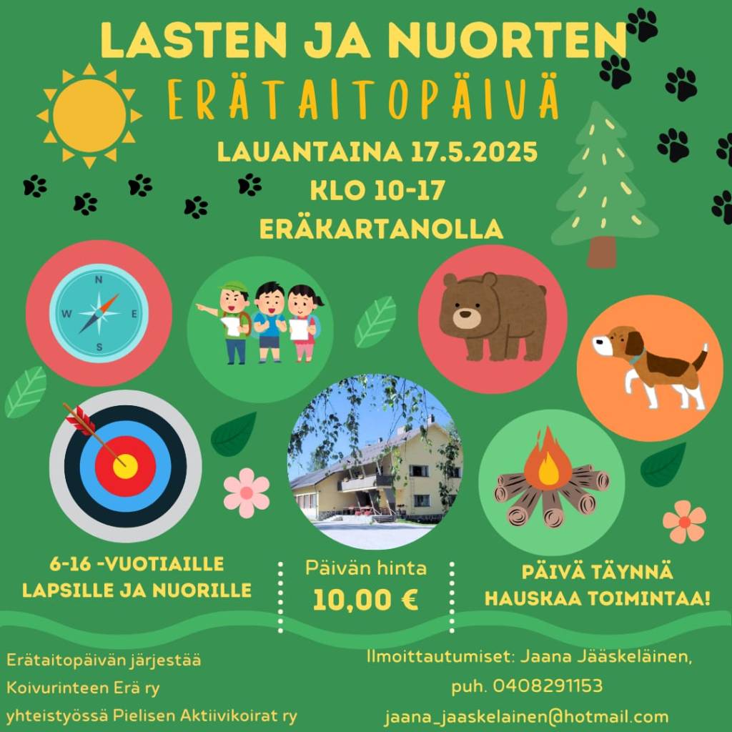 Lasten ja nuorten erätaitopäivä lauantaina 17.5.2025 klo 10-17 Koivurinteen Erän EräkartanollaTapahtuman järjestää Koivurinteen Erä ry yhteistyössä Pielisen Aktiivikoirat ry:n kanssa.
